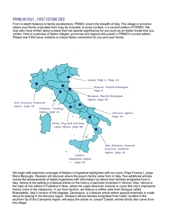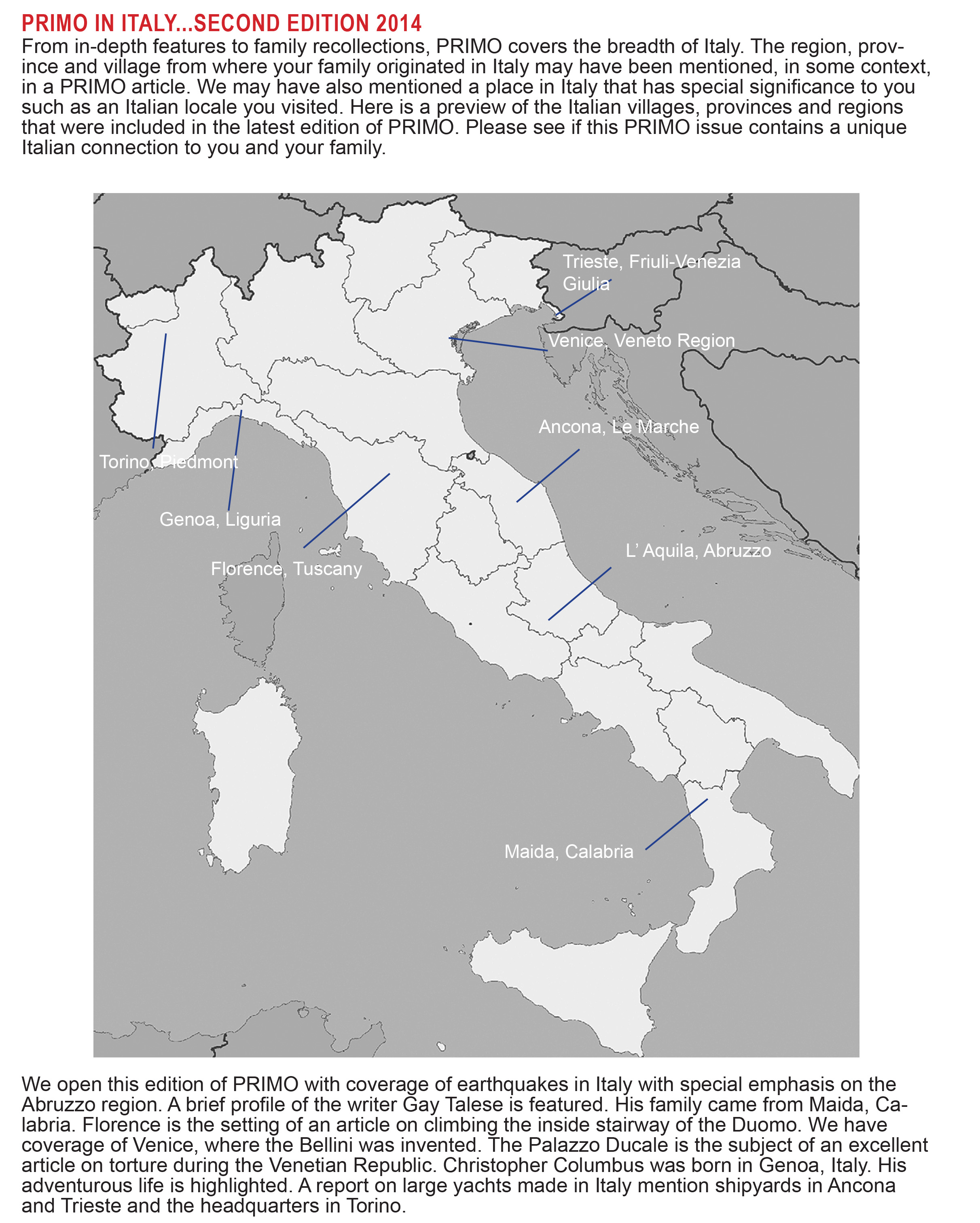Content Notice: Articles and news reports posted on the PRIMO web site are original and separate from those published in PRIMO magazine. The PRIMO web site does not serve as an alternative to the magazine but rather an added benefit to reading PRIMO, providing a glimpse of what you will find reading in a print edition of PRIMO magazine. Each edition of PRIMO comes with 64 to 72 pages of original content, in-depth feature articles, columns and engrossing essays on all things Italian and Italian American.
