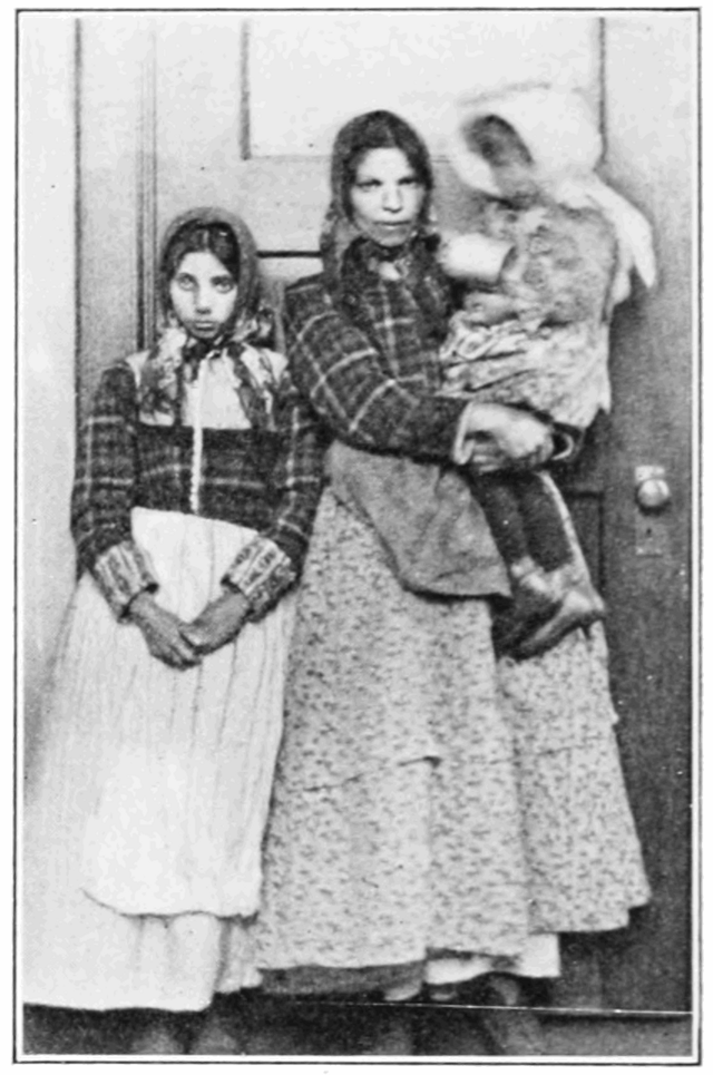 In Ellis Island, men wait in line as does an Italian woman with her two daughters